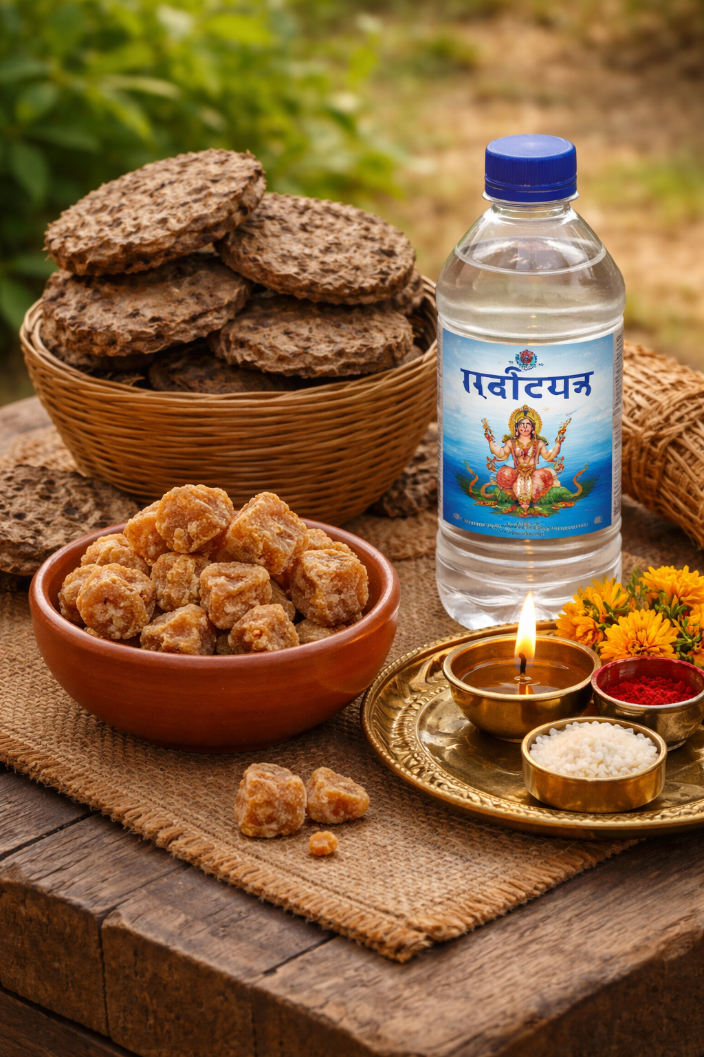 Our Gangajal is carefully sourced from the revered waters of Maa Ganga, preserving its natural purity and spiritual sanctity. The Uple we provide are prepared using age-old methods from desi cow dung, sun-dried naturally, and free from chemicals or artificial processing, ensuring suitability for all sacred rituals.